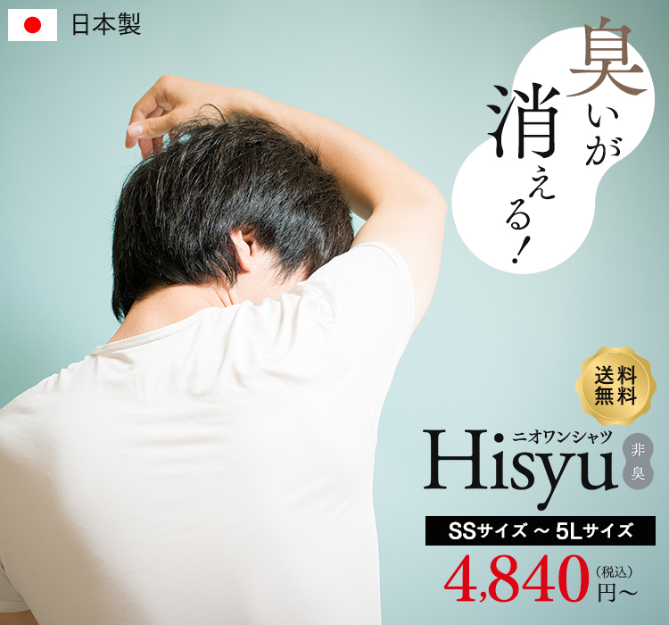 ニオワンシャツHisyuは洗濯回数によって効果が薄れてしまう生地表面の消臭加工ではなく、糸1本1本に練り込んでいるので効果が永続的なのです。